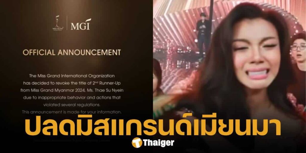 The Miss Grand International Organization has decided to revoke the title of 2nd Runner-Up from Miss Grand Myanmar 2024, Ms. Thae Su Nyein due to inappropriate behavior and actions that violated several regulations.