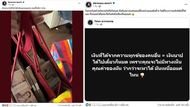 ก่อนจะโพสต์ต่อมาเป็นภาพเงินสดเต็มถุง พร้อมข้อความว่า“บ๊ายบาย ตังค์ที่เก็บไว้สำหรับอนาคตลูกสาว รอบนี้ไปอีก 5 ล้าน” นั้น