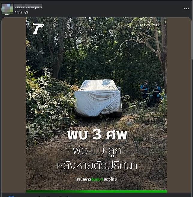 โดยพบว่าเมื่อวันที่ 13 กุมภาพันธ์ เวลา 18.35 น. โน๊ต แชร์ข่าวพบศพ 3 พ่อแม่ลูกหลังหายตัวปริศนา