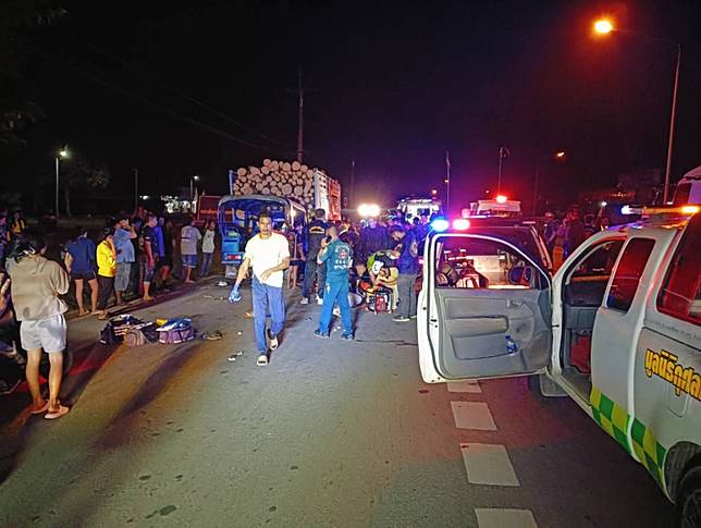ที่เกิดเหตุพบรถบรรทุกสิบล้อบรรทุกไม้ยางพารา ทะเบียน 81-1299 สุราษฎร์ธานี จอดอยู่ริมถนน ด้านท้ายรถบรรทุกมีรถตุ๊กตุ๊ก สีฟ้า ทะเบียน 104732 สุราษฎร์ธานี ชนอัดก๊อบปี้ สภาพด้านหน้าพังยุบเสียหายมาก