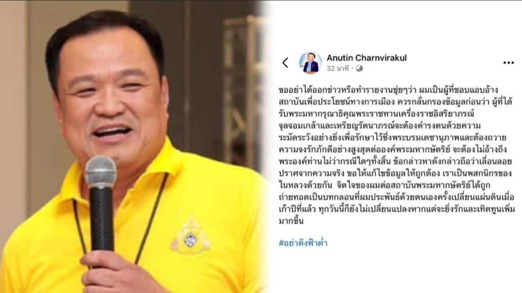เมื่อวันที่ 8พ.ค.2568 นายอนุทิน ชาญวีรกูล รองนายกรัฐมนตรี และรมว.มหาดไทย หัวหน้าพรรคภูมิใจไทย (ภท.) โพสต์เฟซบุ๊กส่วนตัว “Anutin Charnvirakul” ระบุว่า “ขออย่าได้ออกข่าวหรือทำรายงานชุ่ยๆว่า ผมเป็นผู้ที่ชอบแอบอ้างสถาบันเพื่อประโยชน์ทางการเมือง ควรกลั่นกรองข้อมูลก่อนว่า ผู้ที่ได้รับพระมหากรุณาธิคุณพระราชทานเครื่องราชอิสริยาภรณ์จุลจอมเกล้าและเหรียญรัตนาภรณ์จะต้องดำรงตนด้วยความระมัดระวังอย่างยิ่งเพื่อรักษาไว้ซึ่งพระบรมเดชานุภาพและต้องถวายความจงรักภักดีอย่างสูงสุดต่อองค์พระมหากษัตริย์ จะต้องไม่อ้างถึงพระองค์ท่านไม่ว่ากรณีใดๆทั้งสิ้น ข้อกล่าวหาดังกล่าวถือว่าเลื่อนลอย ปราศจากความจริง ขอให้แก้ไขข้อมูลให้ถูกต้อง เราเป็นพสกนิกรของในหลวงด้วยกัน จิตใจของผมต่อสถาบันพระมหากษัตริย์ได้ถูกถ่ายทอดเป็นบทกลอนที่ผมประพันธ์ด้วยตนเองครั้งเปลี่ยนแผ่นดินเมื่อเก้าปีที่แล้ว ทุกวันนี้ก็ยังไม่เปลี่ยนแปลงหากแต่จะยิ่งรักและเทิดทูนเพิ่มมากขึ้น”