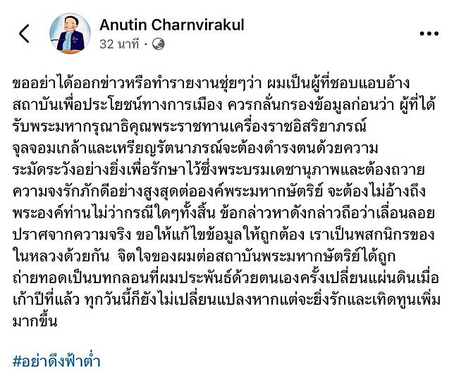 เมื่อวันที่ 8พ.ค.2568 นายอนุทิน ชาญวีรกูล รองนายกรัฐมนตรี และรมว.มหาดไทย หัวหน้าพรรคภูมิใจไทย (ภท.) โพสต์เฟซบุ๊กส่วนตัว “Anutin Charnvirakul” ระบุว่า “ขออย่าได้ออกข่าวหรือทำรายงานชุ่ยๆว่า ผมเป็นผู้ที่ชอบแอบอ้างสถาบันเพื่อประโยชน์ทางการเมือง ควรกลั่นกรองข้อมูลก่อนว่า ผู้ที่ได้รับพระมหากรุณาธิคุณพระราชทานเครื่องราชอิสริยาภรณ์จุลจอมเกล้าและเหรียญรัตนาภรณ์จะต้องดำรงตนด้วยความระมัดระวังอย่างยิ่งเพื่อรักษาไว้ซึ่งพระบรมเดชานุภาพและต้องถวายความจงรักภักดีอย่างสูงสุดต่อองค์พระมหากษัตริย์ จะต้องไม่อ้างถึงพระองค์ท่านไม่ว่ากรณีใดๆทั้งสิ้น ข้อกล่าวหาดังกล่าวถือว่าเลื่อนลอย ปราศจากความจริง ขอให้แก้ไขข้อมูลให้ถูกต้อง เราเป็นพสกนิกรของในหลวงด้วยกัน จิตใจของผมต่อสถาบันพระมหากษัตริย์ได้ถูกถ่ายทอดเป็นบทกลอนที่ผมประพันธ์ด้วยตนเองครั้งเปลี่ยนแผ่นดินเมื่อเก้าปีที่แล้ว ทุกวันนี้ก็ยังไม่เปลี่ยนแปลงหากแต่จะยิ่งรักและเทิดทูนเพิ่มมากขึ้น”