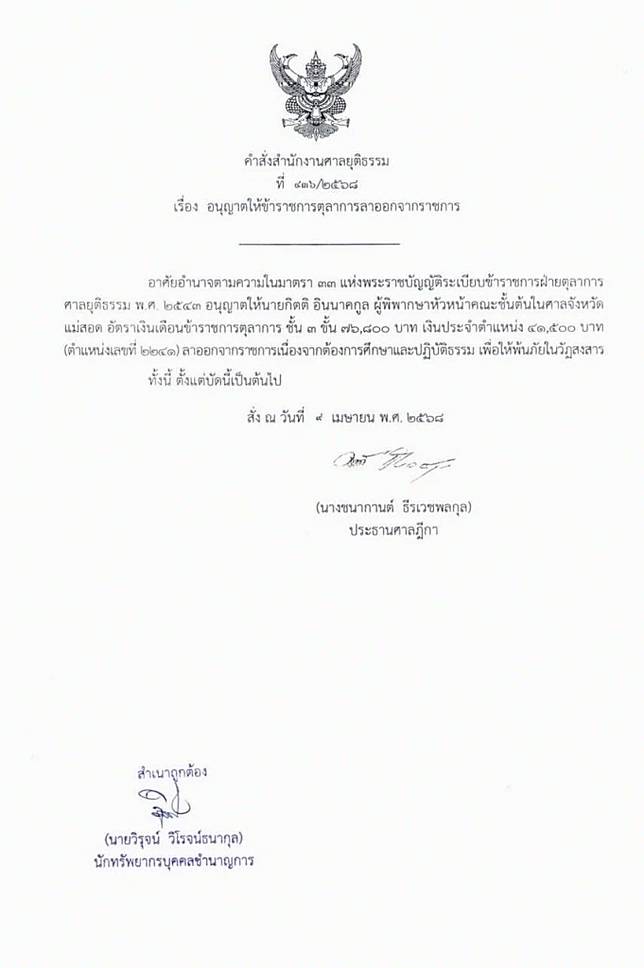 โดยเอกสารฉบับนี้มีนางชนากานต์ ธีรเวชพลกุล ประธานศาลฎีกา เป็นผู้ลงนามในคำสั่งสำนักงานศาลยุติธรรมที่ 436/2568 อนุญาตให้นายกิตติ อินนาคกูล ผู้พิพากษาหัวหน้าคณะชั้นต้น ศาลจังหวัดแม่สอด (ตำแหน่งเลขที่ 2241) ลาออกจากราชการ โดยได้รับเงินเดือนระดับชั้น 3 ขั้น 76,800 บาท และเงินประจำตำแหน่ง 41,500 บาท