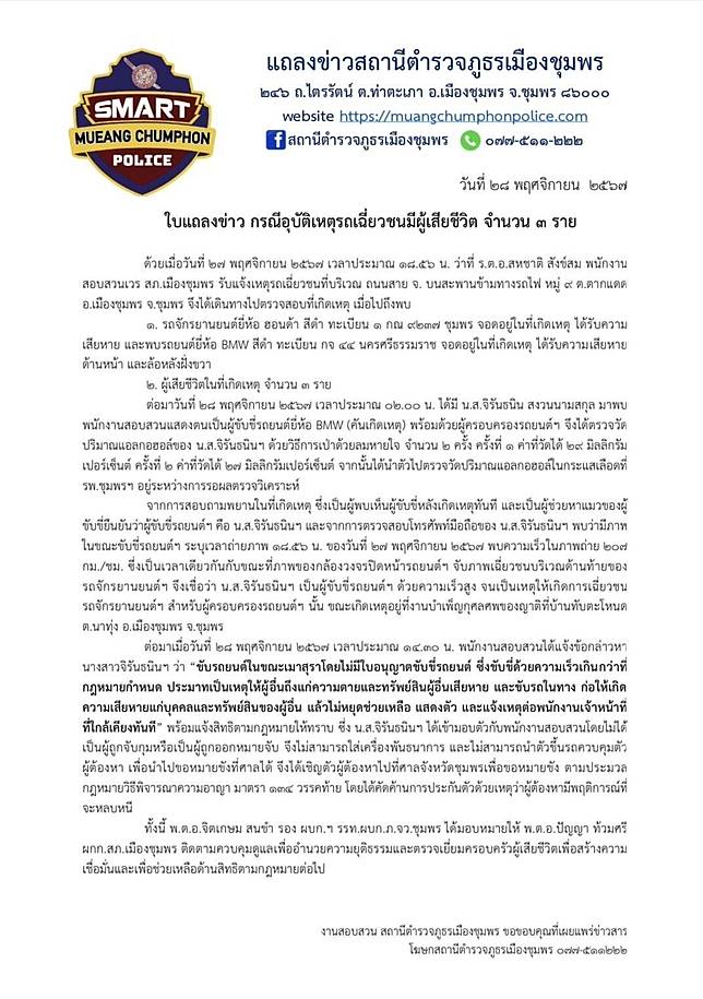 ล่าสุดเวลา 22.00 น. วันที่ 28 พ.ย. สภ.เมืองชุมพร ได้แถลงข่าวกรณีดังกล่าว สรุปใจความดังนี้