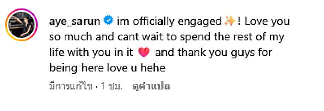 ทั้งนี้ อ้าย สรัลชนา ได้ออกมาโพสต์ภาพถูกคุกเข่าขอแต่งงานพร้อมเเหวนเพชรเม็ดโตผ่านทางอินสตาแกรม aye_sarun พร้อมเขียนแคปชั่นว่า im officially engaged! Love you so much and cant wait to spend the rest of my life with you in it and thank you guys for being here love u hehe