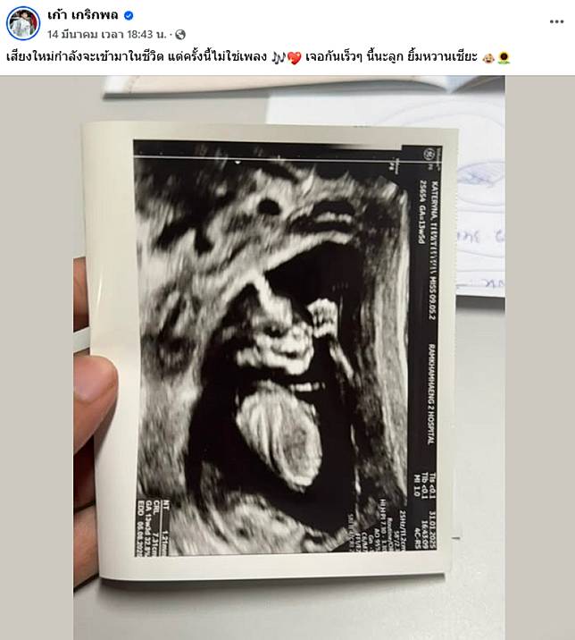 เสียงใหม่กำลังจะเข้ามาในชีวิต แต่ครั้งนี้ไม่ใช่เพลง เจอกันเร็วๆ นี้นะลูก ยิ้มหวานเชียะ ครูเคทท้องแล้ว 20 สัปดาห์ หรือ 5 เดือนแล้ว ท่ามกลางแฟนๆต่างแสดงความยินดีให้กับทั้งคู่กันอย่างมาก