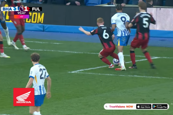 จังหวะปัญหาเกิดนาที 90+5 ขณะเกมทำท่าจะจบแบ่งแต้ม ไบรท์ตัน เปิดบอลเข้าเขตโทษ แฮร์ริสัน รี้ด ฝั่ง “เจ้าสัว” พยายามสกัดทิ้งไปสัมผัสขา เจา เปโดร ที่มาจากด้านหลัง