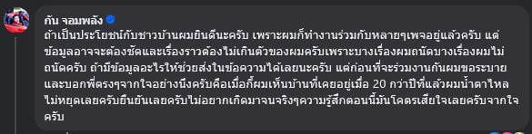 ซึ่ง กัน จอมพลัง ก็ยังได้เข้ามาคอมเมนต์ อีกว่า “ถ้าเป็นประโยชน์กับชาวบ้านผมยินดีนะครับ เพราะผมก็ทำงานร่วมกับหลายๆ เพจอยู่แล้วครับ แต่ข้อมูลอาจจะต้องชัดและเรื่องราวต้องไม่เกินตัวของผมครับเพราะบางเรื่องผมถนัดบางเรื่องผมไม่ถนัดครับ ถ้ามีข้อมูลอะไรให้ช่วยส่งในข้อความได้เลยนะครับ แต่ก่อนที่จะร่วมงานกันผมขอระบายและบอกพี่ตรงๆ จากใจอย่างนึงครับคือเมื่อกี้ผมเห็นบ้านที่เคยอยู่เมื่อ 20 กว่าปีที่แล้วผมน้ำตาไหลไม่หยุดเลยครับ ยืนยันเลยครับไม่อยากเกิดมาจนจริงๆ ความรู้สึกตอนนี้มันโคตรเสียใจเลยครับ จากใจครับ”