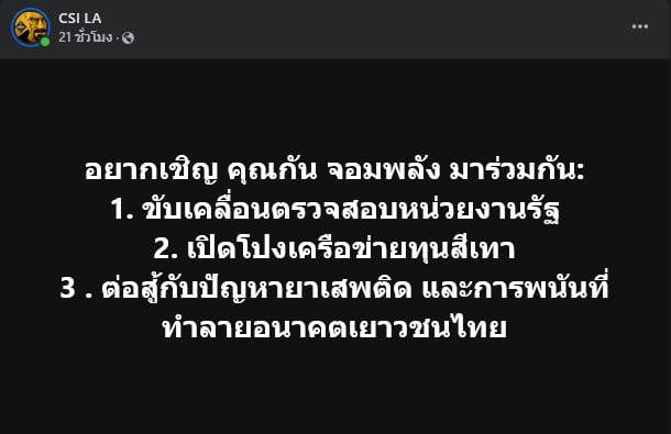 จากนั้น ทางเพจ CSI LA ยังได้โพสต์ข้อความระบุว่า “อยากเชิญ กัน จอมพลัง มาร่วมกันขับเคลื่อนตรวจสอบหน่วยงานรัฐ เปิดโปงเครือข่ายทุนสีเทา ต่อสู้กับปัญหายาเสพติด และการพนันที่ทำลายอนาคตเยาวชนไทย”