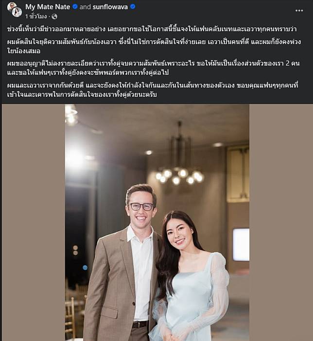 ช่วงนี้เห็นว่ามีข่าวออกมาหลายอย่าง เลยอยากขอใช้โอกาสนี้ชี้แจงให้แฟนคลับเนทและเอวาทุกคนทราบว่า