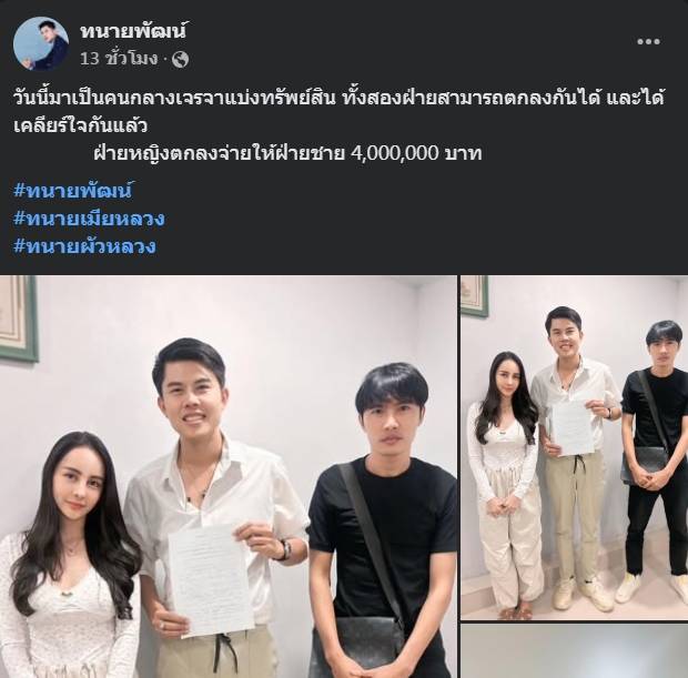โดยระบุข้อความว่า “วันนี้มาเป็นคนกลางเจรจาแบ่งทรัพย์สิน ทั้งสองฝ่ายสามารถตกลงกันได้ และได้เคลียร์ใจกันแล้ว ฝ่ายหญิงตกลงจ่ายให้ฝ่ายชาย 4,000,000 บาท #ทนายเมียหลวง #ทนายผัวหลวง”