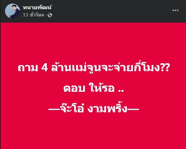 “ถาม 4 ล้านเเม่จูนจะจ่ายกี่โมง?? ตอบ ให้รอ .. จ๊ะโอ๋ งามพริ้ง”
