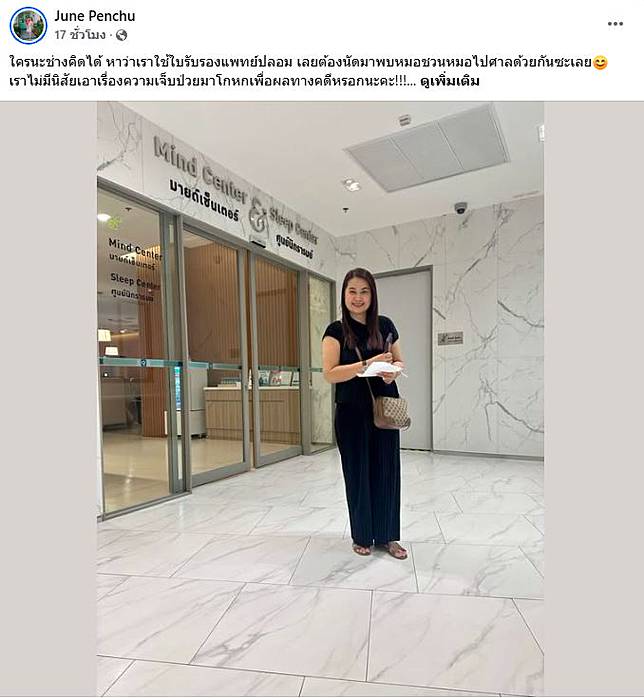 ล่าสุดมีประเด็นใหม่เข้ามาให้ต้องเคลียร์ เมื่อมีคนตั้งข้อสงสัยหรือกล่าวหาว่าเธอใช้ใบรับรองแพทย์ปลอม งานนี้ จูน ไม่ปล่อยผ่าน ออกมาโพสต์ข้อความผ่านเฟซบุ๊กส่วนตัว ตอกกลับนิ่ม ๆ แต่เจ็บจี๊ด พร้อมคำเตือน ระบุว่า “ใครนะช่างคิดได้ หาว่าเราใช้ใบรับรองแพทย์ปลอม เลยต้องนัดมาพบหมอชวนหมอไปศาลด้วยกันซะเลย เราไม่มีนิสัยเอาเรื่องความเจ็บป่วยมาโกหกเพื่อผลทางคดีหรอกนะคะ!!! ฟ้องได้ไม่ว่า ฟ้องกลับก็รับให้ได้ด้วยนะคะ ขอบคุณค่ะ”