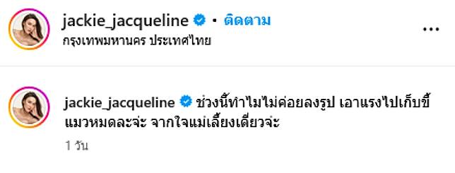 ล่าสุดทางด้าน เเจ็คกี้ ได้ออกมาเคลื่อนไหวผ่านอินสตาแกรม jackie_jacqueline ระบุว่า ช่วงนี้ทำไมไม่ค่อยลงรูป เอาแรงไปเก็บขี้แมวหมดละจ่ะ จากใจแม่เลี้ยงเดี่ยวจ่ะ ท่ามกลางแฟนๆต่างเข้ามาคอมเมนต์ อาทิ ก็ต้องไปควบรวมกับพ่อเลี้ยงเดี่ยวสิครับ,หน้าลูกสาวบอกทุกสิ่ง รักแม่มาก เป็นต้น