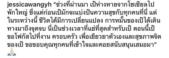 และในแคปชั่นยังระบุว่า… “ช่วงที่ผ่านมา เป้ห่างหายจากโซเชียลไปพักใหญ่ ซึ่งแต่ก่อนเป้มักจะแบ่งปันความสุขกับทุกคนที่นี่ แต่ในระหว่างนี้ ชีวิตได้มีการเปลี่ยนแปลง การหมั้นของเป้ได้เดินทางมาถึงจุดจบ นี่เป็นช่วงเวลาที่แย่ที่สุดสำหรับเป้ ตอนนี้เป้ขอโฟกัสไปที่งาน ครอบครัว เพื่อเยียวยาตัวเองและสุขภาพจิตของเป้ ขอขอบคุณทุกคนที่เข้าใจและคอยสนับสนุนเสมอมา”…