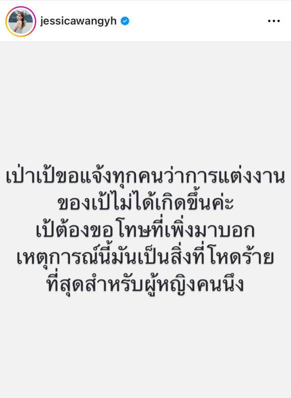 ทำเอาแฟนคลับช็อกไปตามๆ หลัง “เป่าเป้ เจสสิก้า หวัง” แชมป์มาสเตอร์เชฟ ประเทศไทย ซีซั่น 3 โพสต์ไอจีถึงเรื่องงานแต่งที่จะไม่เกิดขึ้นแล้ว หลังเพิ่งหมั้นกับแฟนหนุ่มไปเมื่อปลายปีที่แล้ว