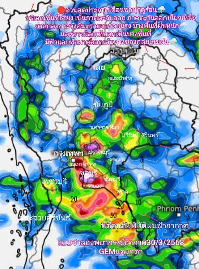 เมื่อวันที่ 30 มีนาคม 68 เพจ เตือนภัยพิบัติฝนฟ้าอากาศ ได้โพสต์แจ้งเตือนระบุว่า ด่วนสุดจากนี้ไปเตรียมตัวรับแรงปะทะเตือนรับมือพายุฤดูร้อน พื้นที่เสี่ยง อุบลราชธานี ศรีสะเกษ สุรินทร์ บุรีรัมย์ นครราชสีมา ปราจีนบุรี นครนายก ฉะเชิงเทรา จันทบุรี ตราด ระยอง ชลบุรี สมุทรปราการ สมุทรสาคร กรุงเทพมหานคร ปทุมธานี นนทบุรี สระบุรี พระนครศรีอยุธยา นครนายก ลพบุรี เพชรบูรณ์ ชัยภูมิ หนองบัวลำภู เลย ตาก เพชรบุรี ราชบุรี ประจวบคีรีขันธ์ อุดรธานี หนองคาย พิษณุโลก กาญจนบุรี แม่ฮ่องสอน เชียงใหม่ พะเยา ชาร์จแบตให้เต็มเพราะอาจจะเกิดปัญหาไฟดับตามมาได้ ระวังอันตรายจากแรงลม ฟ้าแรงมากมีฟ้าแลบฟ้าผ่าตลอดเส้นทางของกลุ่มเมฆฝน อาจมีลูกเห็บตกเป็นบางพื้นที่ หลังคาบ้าน เสาไฟฟ้า ต้นไม้ใหญ่ สิ่งปลูกสร้างที่ไม่มั่นคงแข็งแรงต้องระวัง ลักษณะอากาศทั่วไป30 มีนาคม 2568 จากกรมอุตุนิยมวิทยา
