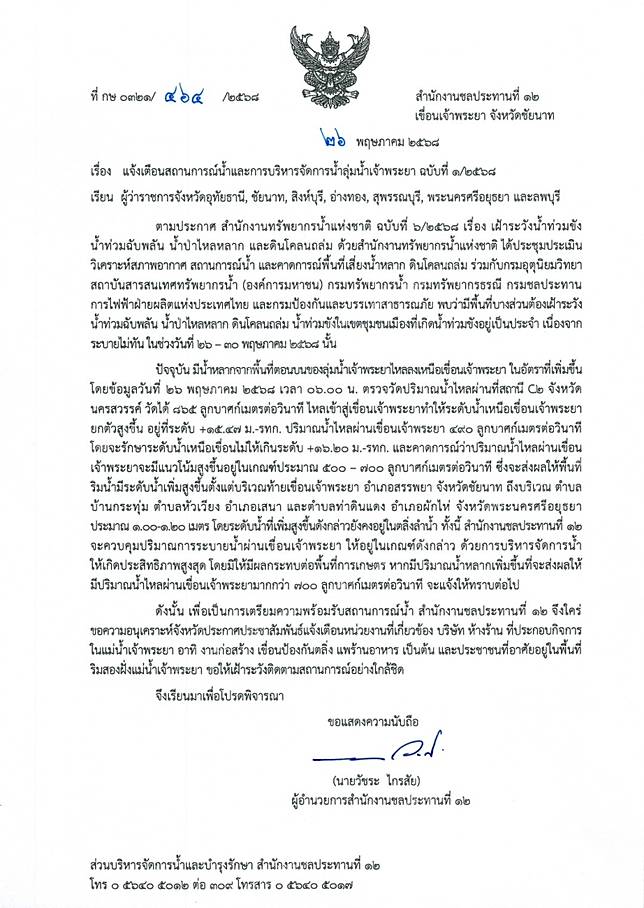 นายวัชระ ไกรสัย ผู้อำนวยการสำนักงานชลประทานที่ 12 ออกหนังสือแจ้งเตือนสถานการณ์น้ำลุ่มน้ำเจ้าพระยา ฉบับที่ 1/2568 ส่งถึงผู้ว่าราชการจังหวัดในพื้นที่เสี่ยง ได้แก่ อุทัยธานี, ชัยนาท, สิงห์บุรี, อ่างทอง, สุพรรณบุรี, พระนครศรีอยุธยา และลพบุรี เพื่อเตรียมรับมือสถานการณ์น้ำหลากจากพื้นที่ตอนบนไหลลงสู่เขื่อนเจ้าพระยา