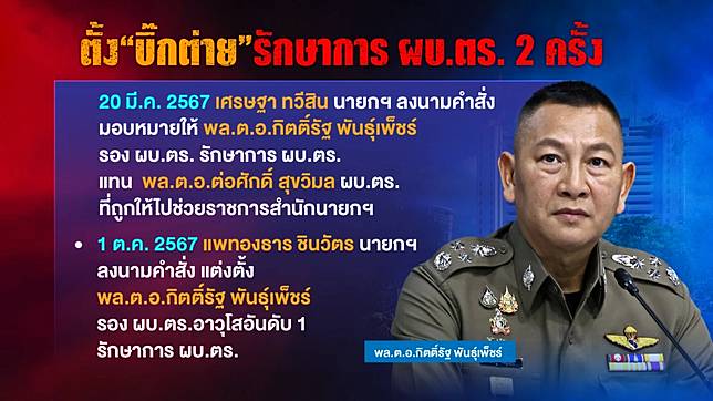 ล่าสุด มีรายงานว่า นางสาวแพทองธาร ได้เสนอชื่อ บิ๊กต่าย-พล.ต.อ.กิตติ์รัฐ พันธุ์เพ็ชร์ รองผู้บัญชาการตำรวจแห่งชาติ (รอง ผบ.ตร.) อาวุโสอันดับ 1 ให้เป็น ผบ.ตร.คนที่ 15 ต่อจาก พล.ต.อ.ต่อศักดิ์ สุขวิมล ที่เกษียณอายุราชการไป ซึ่งที่ประชุม ก.ตร. ก็ได้ให้ความเห็นชอบด้วยมติเอกฉันท์ ในเวลา 15.30 น.