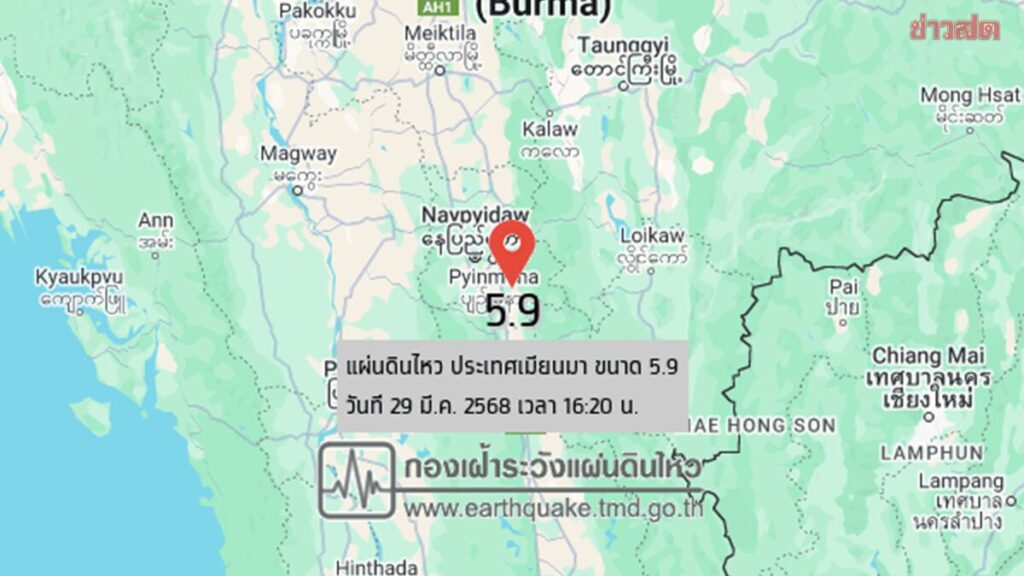 อ่านข่าวต้นฉบับได้ที่ : ด่วน! เมียนมาไหวอีกแล้ว ขนาด 5.9 ห่างแม่ฮ่องสอน 176 กม. 3 จังหวัดไทยรับรู้แรงสั่นสะเทือน