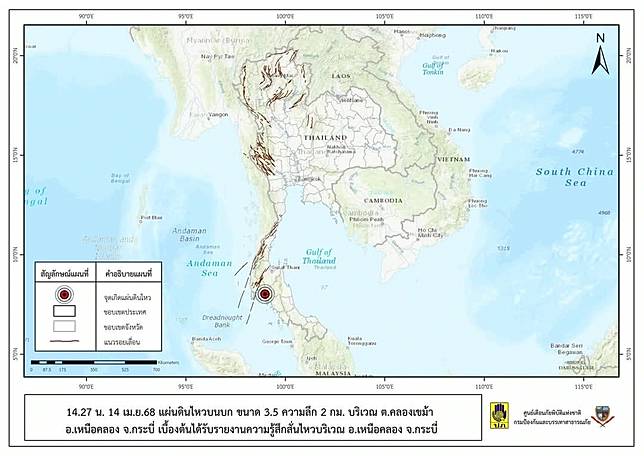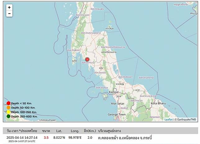 14 เมษายน 2568 เมื่อเวลา 14.27 น. เกิดเหตุแผ่นดินไหว ต.คลองเขม้า อ.เหนือคลอง จ.กระบี่ ขนาด 3.5 ความลึก 2 กิโลเมตร รู้สึกสั่นไหวบริเวณ อำเภอเหนือคลอง จังหวัดกระบี่