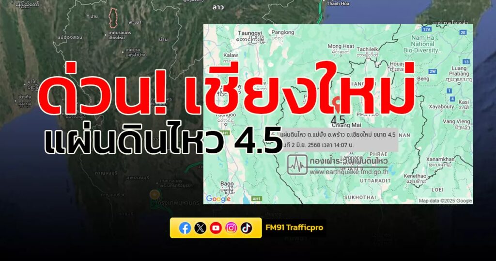 ด่วน! แผ่นดินไหว จ.เชียงใหม่ ขนาด 4.5 ลึก 1 กิโลเมตร รับรู้ถึงแรงสั่นสะเทือน