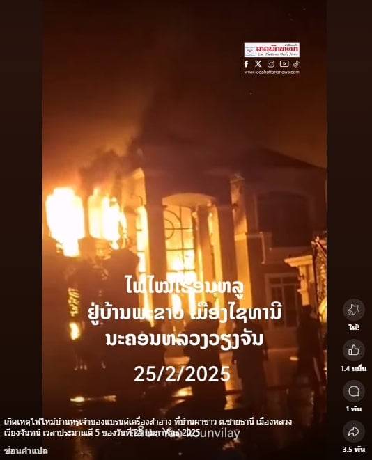 ด่วน! ไฟไหม้คฤหาสน์หรูนครเวียงจันทน์ ช่วงรุ่งเช้า ก่อนพบร่าง ไฮโซสาว เจ้าของแบรนด์เครื่องสำอางค์ชื่อดังในสปป.ลาว ติดอยู่ภายในบ้าน เสียชีวิตสลด