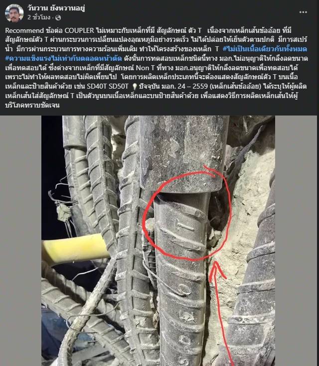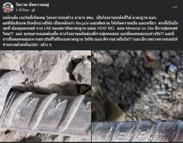 นอกจากนี้ยังระบุอีกว่า เหล็กเส้น เจอในที่เกิดเหตุ โครงการก่อสร้าง อาคาร สตง. เป็นโรงงานเหล็กที่ได้ มาตรฐาน มอก. แต่ข้อสังเกต มีเหล็กบางยี่ห้อ เป็นเหล็กเก่า Recycle และเติมธาตุ ให้เกิดความแข็ง และเหนียว ตรงนี้เป็นอีกจุดที่ ต้องดูผลเทสต์ จาก LAB ของสถาบันมาตรฐาน แต่ละ HEAT NO. ตอน Meterial on Site มีการสุ่มเทสต์ไหม?? และ ทุกๆเตาหลอมต้องยื่น ทางโรงงานผลิตต้องมีการสุ่มทดสอบ และมีผลทดสอบอย่างไร?? และมีการยื่นผลทดสอบจากสถาบันที้ได้รับรองมาตรฐาน ให้กับ มอก.พิจารณาหรือไม่? มอก.มีการตรวจทานก่อนให้จำหน่ายด้วยหรือเปล่า เย้วว ๆ