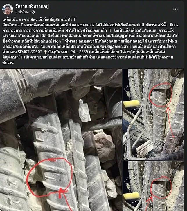 ล่าสุดผู้ใช้เฟซบุ๊กรายหนึ่ง ซึ่งเป็นวิศวะกร จิตอาสา มีความรู้เรื่องเหล็ก ได้มีการวิเคราะห์ ถึงเหล็กโครงสร้าง ตึก สตง. ที่พังถล่ม จากเหตุการณ์แผ่นดินไหวโดยระบุว่า เป็นไปตามสมมุติฐาน : อาคาร สตง.ใช้ เหล็ก DB. 32 SD.50 ซึ่งเป็นเหล็กมีปัญหา คือ ตั้งแต่ผมทำงานรถไฟฟ้าใต้ดิน เหล็กชนิดนี้ ค่าผล Test จาก Lab ผลทดสอบ ค่า Yield ต่ำ แต่ค่า strength จะผ่าน ได้ผลทดสอบ เกิน 5,000 kg/cm2 แต่ ค่า Bending จะมีปัญหา ปริแตก เป็นเหล็ก 2 ชั้น แข็งนอก อ่อนใน และรอยขาด จะเป็นกรวยดั่งรูป หากเหล็กถูกบิดไปมาจะปริแตก ร้าวเข้าในพื้นที่หน้าตัด ทำให้หน้าตัดเหล็ก( AS ) ลดลง ค่า STRENGTH จะหายไปทันที คือ เหล็ก เกรดนี้ไม่เหมาะกับอาคารสูงที่มีการขยับตัว