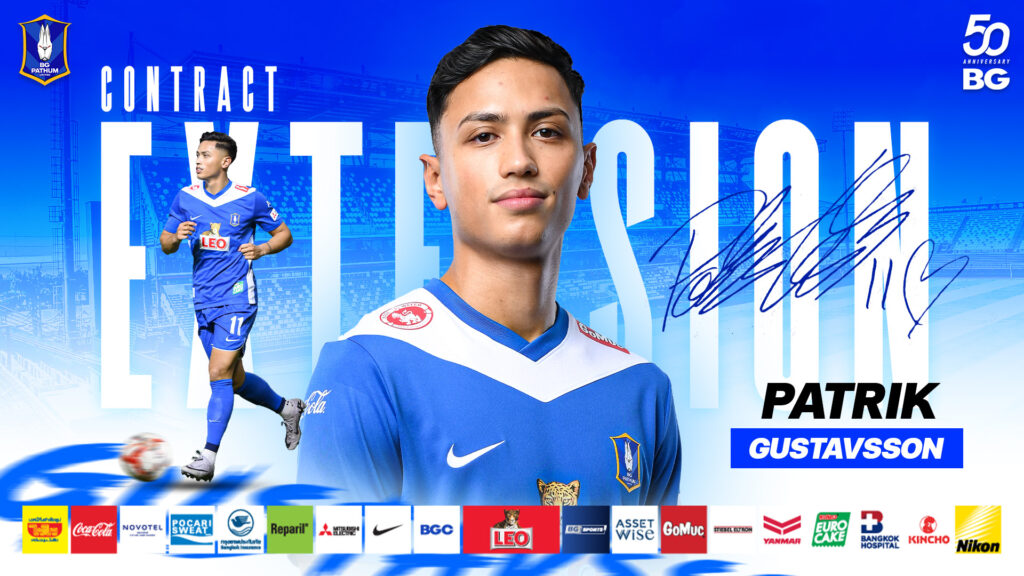 สโมสรบีจี ปทุม ยูไนเต็ด ประกาศต่อสัญญากับ พาตริก กุสตาฟส์สัน กองหน้าทีมชาติไทยในวัย 23 ปี ออกไปอีก 4 ปี จนถึงปี 2029