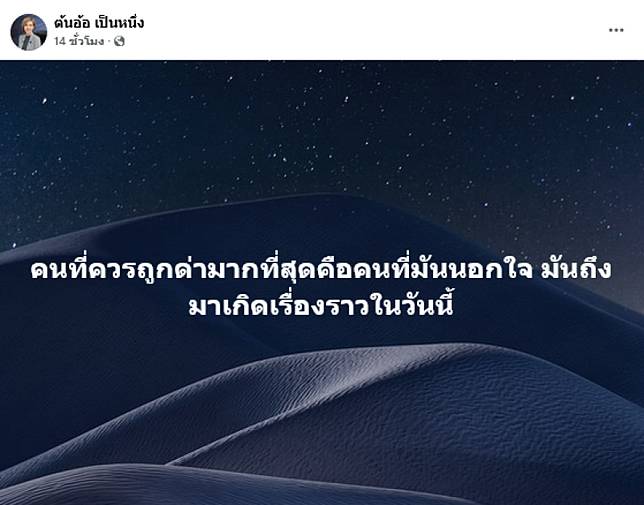 จากนั้นโพสต์ข้อความอีกว่า คนที่ควรถูกด่ามากที่สุด คือคนที่มันนอกใจ มันถึงมาเกิดเรื่องราวในวันนี้