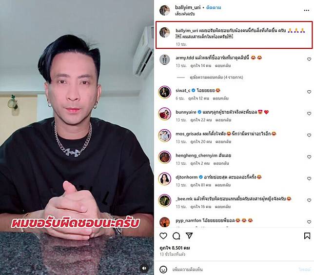 ตลกดังบอล เชิญยิ้ม โพสต์ คลิป “ผมขอรับผิดชอบกับน้องคนนี้กับสิ่งที่เกิดขึ้น ครับ ผมสงสารเด็กในท้องครับ” โดย บอล เผยในคลิปด้วยว่า
