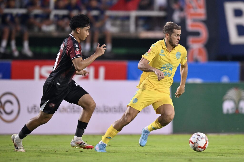 นาทีที่ 14 ช้างป่าห้วยขาแข้ง ได้บุกบ้าง ทิตาธร อักษรศรี ได้บอลทางขวาก่อนจะม้วนสลัดการประกบของ โกรัน เคาซิช พ้นแล้วลากเข้าไปยิงนอกกรอบด้วยขวาบอลลอยไปที่เสาแรก นีล เอเธอร์ริดจ์ นายด่านปราสาทสายฟ้า ต้องออกแรงชกบอลออกหลังไป
