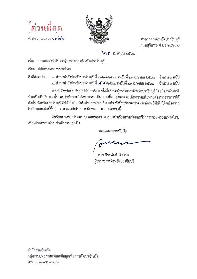 เปิดหนังสือ ผู้ว่าฯปราจีน ถึงปลัดมท. ขออภัยผิดพลาดปมตั้ง ‘ชาวต่างชาติ’ นั่งที่ปรึกษา เผย ‘หนุ่มจีน’ อาสาทำงานเอง ขอทำเรื่องที่เป็นประโยชน์พี่น้องปราจีน