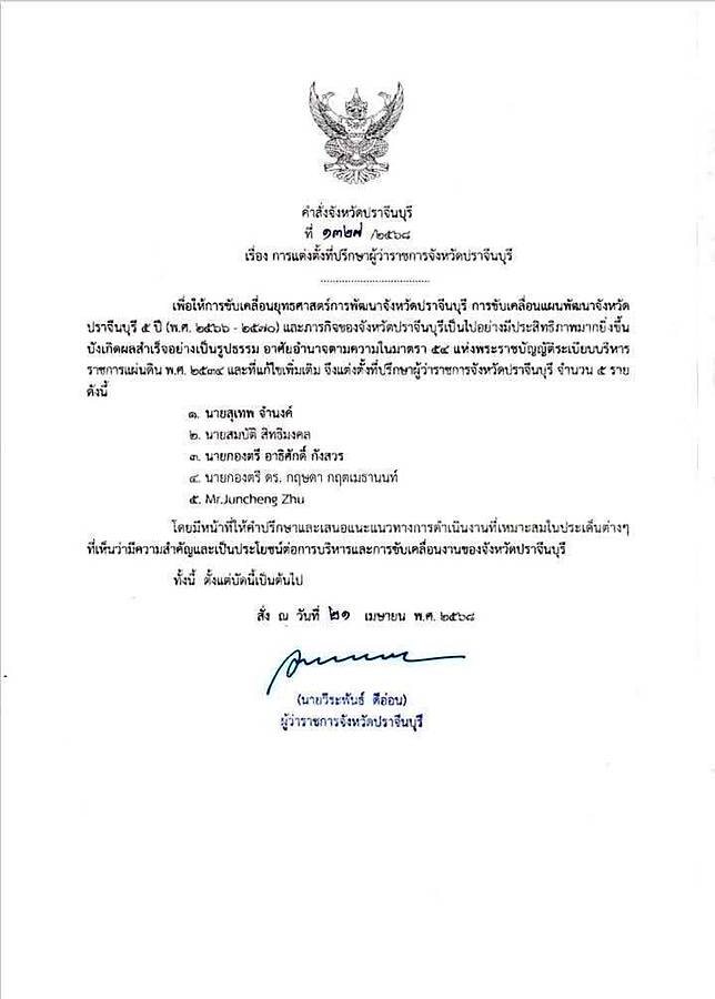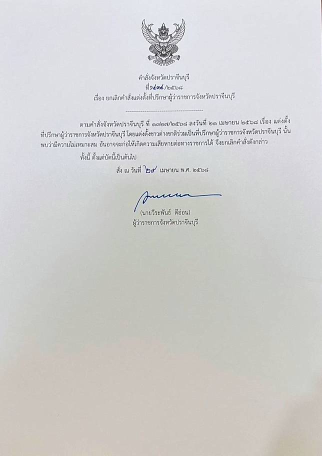 - ผู้ว่าฯปราจีน เซ็นยกเลิกตั้ง ‘ชายชาวจีน’ เป็นที่ปรึกษา ชี้ไม่เหมาะสม อาจเสียหายต่อราชการ