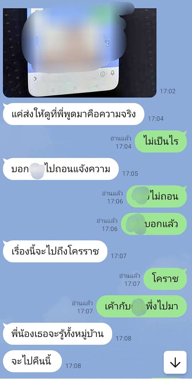 ต่อมากันจอมพลังเผยอีกว่า พ่อเลี้ยงขู่ให้น้องไปถอนแจ้งความที่พ่อเลี้ยงอนาจารน้องพร้อมกับส่งภาพมาให้แม่น้องดูว่าตนมีภาพลับของน้องจริง ถ้าไม่ยอมถอนแจ้งความจะนำภาพไปถ่ายเอกสารและนำไปแปะให้พี่น้องในหมู่บ้านที่โคราชต้องอาย เคสนี้ผมรับปากช่วยท่าน ผกก สน ตลิ่งชัน ลั่นเร่งขอหมาย มาดูกันว่าใครจะโดนก่อน