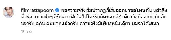 จากนั้น ฟิล์ม รัฐภูมิ ได้โพสต์ข้อความดังกล่าวในอินสตาแกรมส่วนตัว พร้อมกับแคปชันว่า พอความจริงเริ่มปรากฏก็เริ่มออกมาขอโทษกัน แล้วสิ่งที่ พ่อ แม่ แฟน ๆ ที่รักผม เสียใจไปใครรับผิดชอบดี? เดียวยังมีออกมากันอีกนะครับ ดูกัน ผมบอกแล้วครับ ความจริงมีเพียงหนึ่งเดียว ผมรอได้เสมอ .-ไนน์เอ็นเตอร์เทน