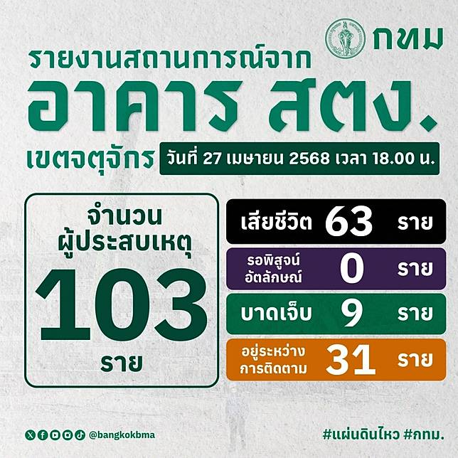 โดยสรุปจำนวนผู้ประสบภัยในครั้งนี้มีรายละเอียดดังนี้ อัพเดท เวลา 18:00 น. วันที่ 27 เม.ย 68 เหตุอาคาร สตง. ถล่ม พื้นที่จตุจักร กทม.