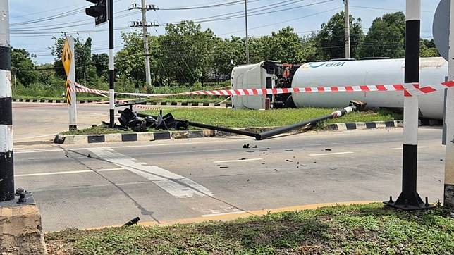 วันที่ 24 พ.ค.68 เวลา 09.10 น. ร.ต.ท.ขวัญใจ ทองดี หัวหน้าสายตรวจสภ.จอมบึง จ.ราชบุรี ได้รับแจ้งเหตุรถบยรทุกแก๊สหุงต้มพลิกคว่ำบริเวณสี่แยกไฟแดงปากบึง ม.2 ต.จอมบึง อ.จอมบึง จึงเดินทางไปตรวจสอบพบรถบรรทุก 18 ล้อขนาดใหญ่ ยี่ห้อ ฮีโน่ สีขาว หมายเลขทะเบียน ส่วนหัว70-8820 ราชบุรี ส่วนหางทะเบียน 70-8820 กาญจนบุรี ด้านมีถังแคปซูลภายในบรรจุแก๊สหุงต้มจำนวน 17 ตัน พลิกคว่ำทับเสาสัณญานไฟจราจรเสียหายไป 1 ต้น เจ้าหน้าที่ต้องนำเชือกเข้าไปกั้นพื้นที่ห้ามผู้ไม่เกี่ยวข้องเข้าไป