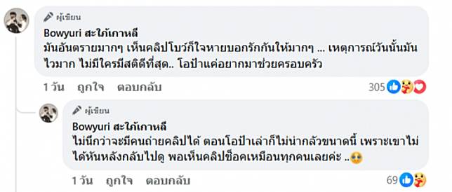 “ตอนแรกโอป้าเล่าให้ฟังยังไม่รู้สึกว่ามันน่ากลัวขนาดนั้น เพราะเขาไม่ได้มองย้อนกลับไป พอมาเห็นคลิปจริง ๆ โบว์เองก็ช็อก เหมือนกับทุกคนเลยค่ะ…มันเป็นวินาทีที่ไม่มีใครมีสติดีที่สุด โอป้าแค่อยากช่วยครอบครัวเท่านั้นเอง”