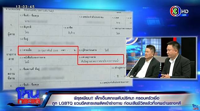 ในรายการ “โหนกระแส” ที่มี หนุ่ม กรรชัย เป็นพิธีกร ครอบครัวของน้องมาร์คได้ร่วมพูดคุยกับผู้เชี่ยวชาญ อาทิ หมอหมู รศ.นพ.วีระศักดิ์ จรัสชัยศรี แพทย์นิติเวช มศว และรองแต้ม พล.ต.ต.วิชัย สังข์ประไพ โดยเปิดเผยใบมรณบัตรระบุว่า “ขาดอากาศหายใจจากการจมน้ำ” แต่จากการชันสูตรศพพบว่าสภาพศพของน้องมาร์คมีลักษณะผิดปกติ