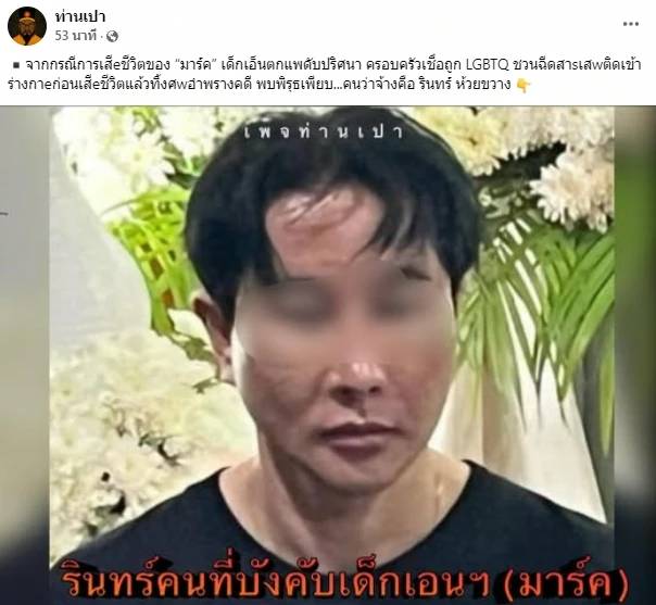 อย่างไรก็ตาม ด้านเพจ ท่านเปา (เพจใหม่อีซ้อ) ได้โพสต์ภาพของผู้จ้างวาน น้องมาร์ค ในงานดังกล่าว พร้อมระบุข้อความว่า “จากกรณีการเสียชีวิตของ “มาร์ค” เด็กเอนตกแพดับปริศนา ครอบครัวเชื่อถูก LGBTQ + ชวนฉีดสารเสพติดเข้าร่างกายก่อนเสียชีวิตแล้วทิ้งศพอำพรางคดี พบพิรุธเพียบ…คนว่าจ้างคือ รินทร์ ห้วยขวาง“