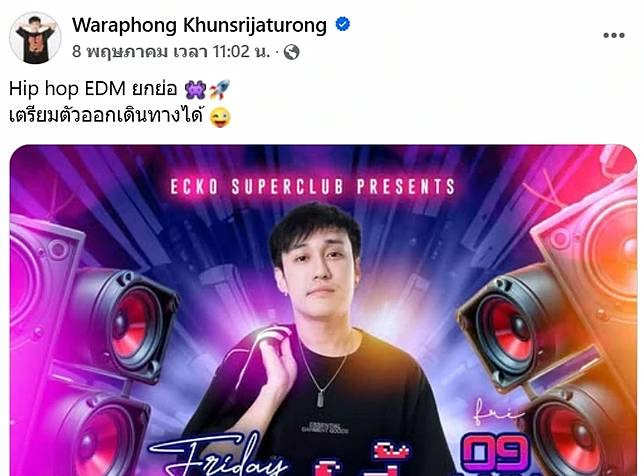 ในขณะเดียวกัน พบว่า โพสต์สุดท้ายของดีเจเตเต้ในเฟซบุ๊ก เป็นคลิปวิดีโอขำขัน ลงไว้เมื่อวันที่ 13 พฤษภาคม ก่อนจะหายตัวไปในคืนต่อมา และก่อนหน้านั้นเมื่อวันที่ 8 พฤษภาคม เขาโพสต์ภาพโปรโมทงานของตนเองในผับ พร้อมข้อความว่า
