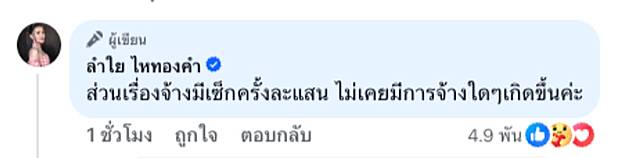 นอกจากนี้ ลำไย ยังแจงเรื่องจ้างมีเซ็กซ์เอาไว้ว่า “ส่วนเรื่องจ้างมีเซ็กซ์ครั้งละแสน ไม่เคยมีการจ้างใดๆ เกิดขึ้นค่ะ”