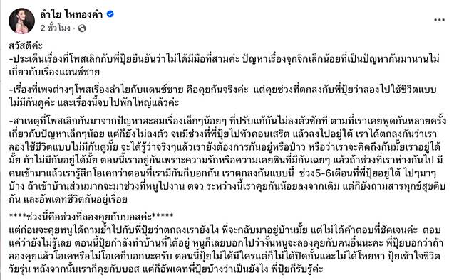 และล่าสุด ลำไย ไหทองคำ ได้ออกมาโพสต์ชี้แจงอย่างละเอียดยิบถึงเรื่องราวที่เกิดขึ้นหลังจากมีเพจต่างๆ ออกมาขุดถึงสาเหตุที่ ลำไยและปุ้ยเลิกกัน น่าจะเป็นเรื่องของมือที่สาม ซึ่งเป็นแดนเซอร์ในวง ซึ่งเจ้าตัวได้อธิบายอย่างละเอียดเอาไว้ว่า