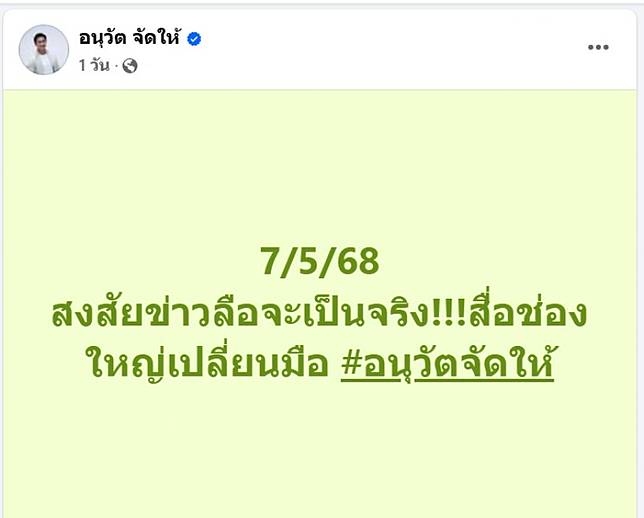 กลายเป็นโพสต์ที่ถูกแชร์ต่ออย่างรวดเร็วในโลกออนไลน์ เมื่อ“อนุวัต เฟื่องทองแดง” ผู้ประกาศข่าวชื่อดังจากช่องวัน 31 ออกมาโพสต์ข้อความปริศนาผ่านเฟซบุ๊กส่วนตัวว่า: