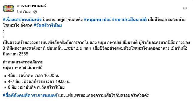 เป็นข่าวเศร้าของวงการบันเทิงอีกครั้งกับการจากไปของ หนุ่ม กษาปณ์ สัมมาบัติ ผู้กำกับละครมากฝีมือทางช่อง3 ที่มีผลงานละครดังอาทิ ซ่อนกลิ่น ระบำเมฆ ฯลฯ เสียชีวิตอย่างสงบด้วยโรคมะเร็งหลอดอาหาร เมื่อวันที่2 มิถุนายน 2568