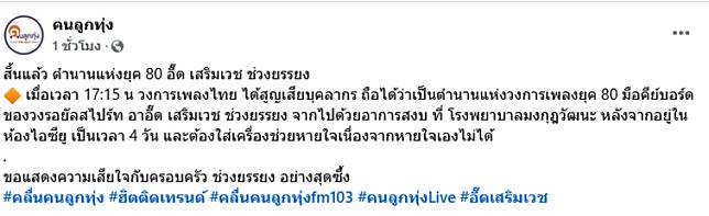 เรียกได้ว่าเป็นอีกหนึ่งข่าวเศร้าของวงการเลยทีเดียวสำหรับการจากไปของ ตำนานแห่งยุค 80 อี๊ด เสริมเวช ช่วงยรรยง มือคีย์บอร์ดคนดังแห่งวง Royal Sprites หลังจากที่ก่อนหน้านี้ ได้ป่วยหนักเข้ารับการรักษาตัวที่โรงพยาบาลในห้อง ICU โดยได้รับการปั๊มหัวใจเพื่อช่วยชีวิต