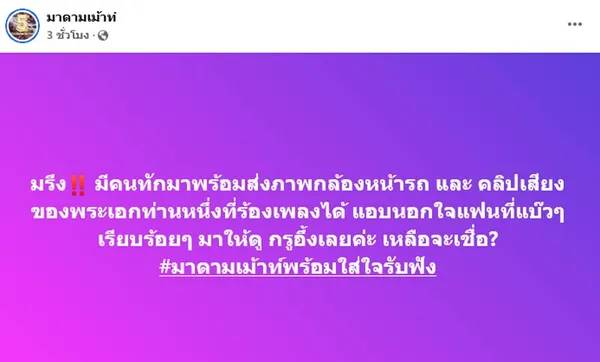 โดยเพจดังได้โพสต์ว่า “มรึง!! มีคนทักมาพร้อมส่งภาพกล้องหน้ารถ และคลิปเสียงของพระเอกท่านหนึ่งที่ร้องเพลงได้ แอบนอกใจแฟนที่แบ๊วๆ เรียบร้อยๆ มาให้ดู กรูอึ้งเลยค่ะ เหลือจะเชื่อ?”