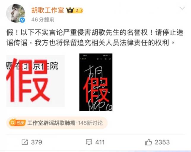 หูเกอ นักแสดงชื่อดังจากจีน ตกเป็นข่าวลือทางออนไลน์ว่า ป่วยเป็นมะเร็งปอด และเข้ารักษาตัวที่โรงพยาบาลในปักกิ่ง ล่าสุด เมื่อคืนวันที่ 20 กุมภาพันธ์ สตูดิโอของเขาได้ออกมา ปฏิเสธข่าวลือ ผ่าน Weibo โดยยืนยันว่าเป็น “ข่าวปลอม” และเตรียมดำเนินการทางกฎหมายกับผู้ปล่อยข่าว